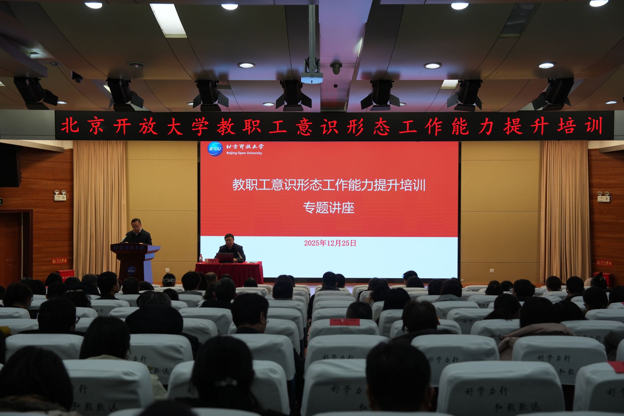 根据学校教职工意识形态工作能力提升专题培训安排,12月25日下午,邀请中央党校(国家行政学院)唐爱军教授来校做专题辅导报告,党委副书记殷文生主持培训并讲话 91成人抖音,全体教职工参加。